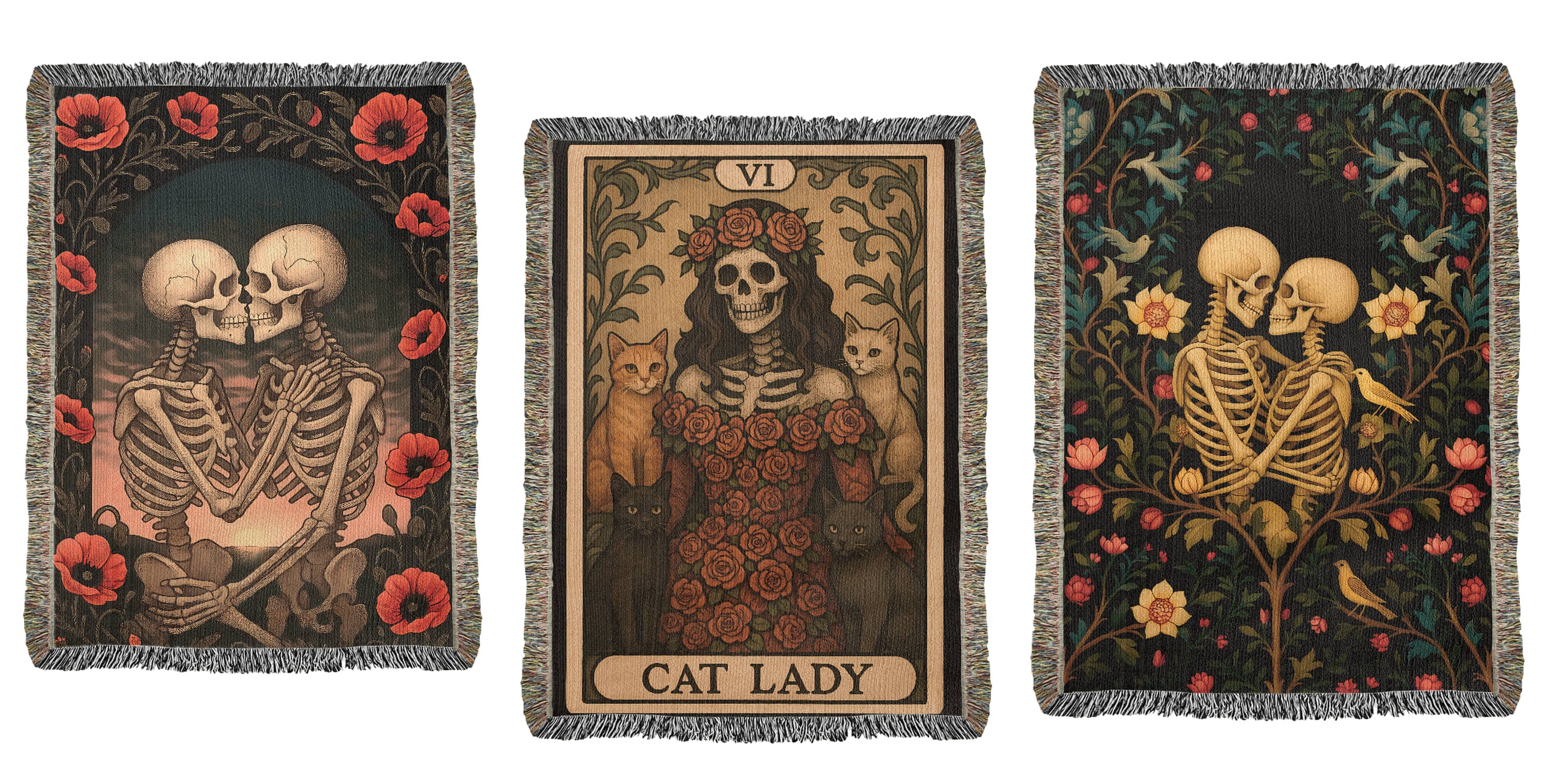 Premium Woven Cotton Throw – Skeleton Cat Lady Dressed in Red Roses with Four Cats, “Cat Lady” Card Artwork