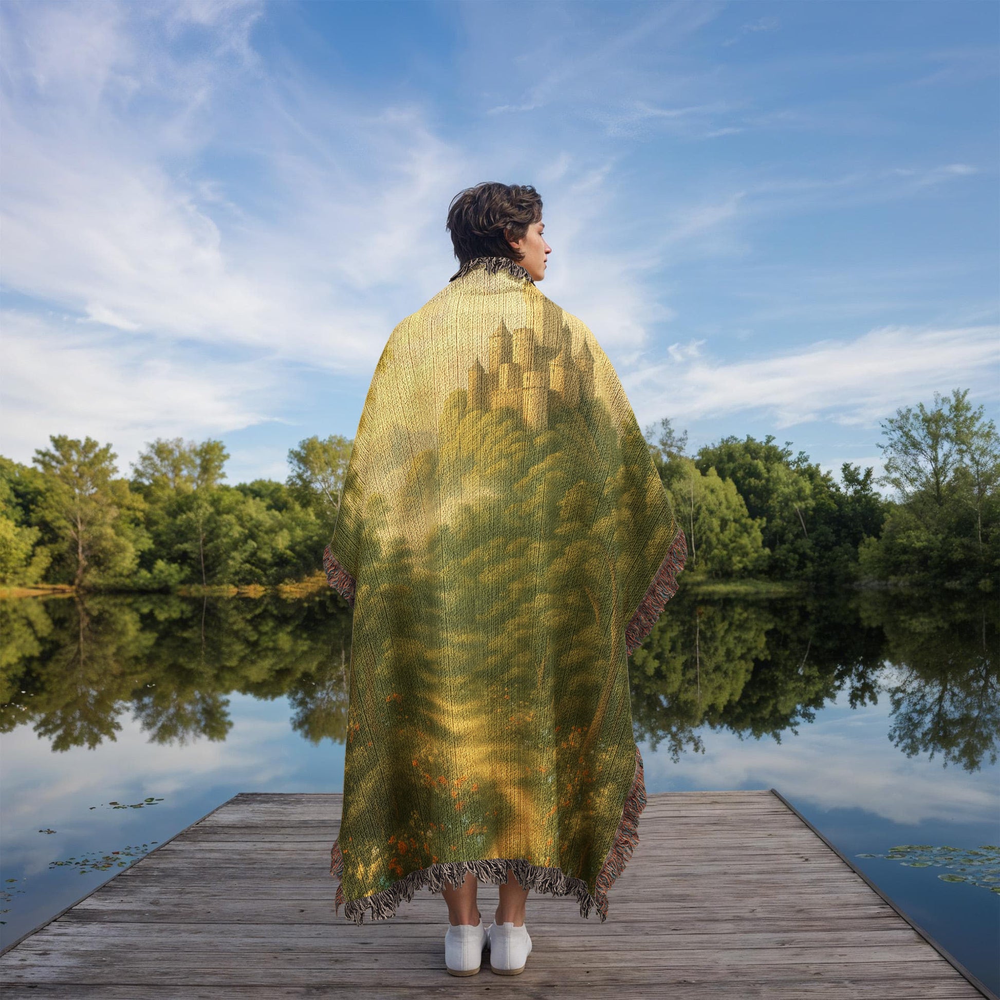 Premium Woven Cotton Throw – Fantasy Castle Rising above Trees on Hill