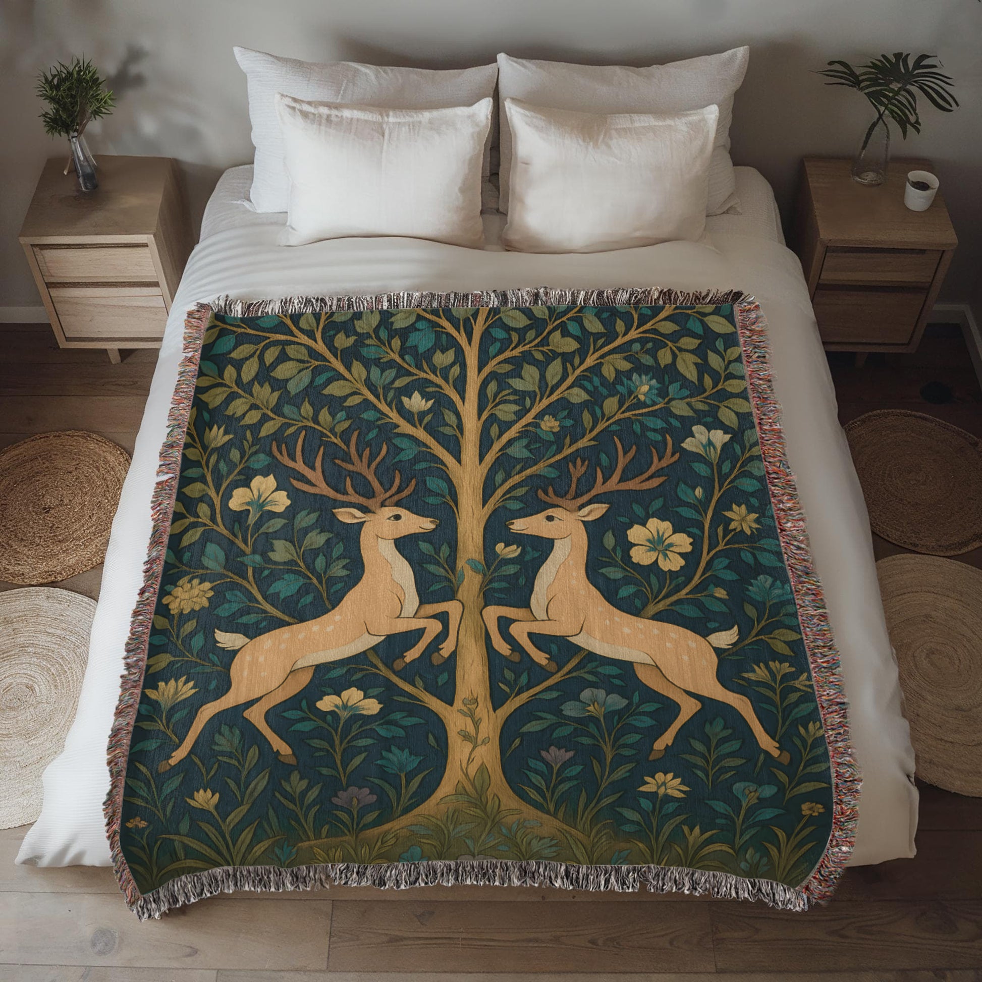 Premium Woven Cotton Throw – Fantasy Deer Duo Rearing Face to Face under Enchanted Tree