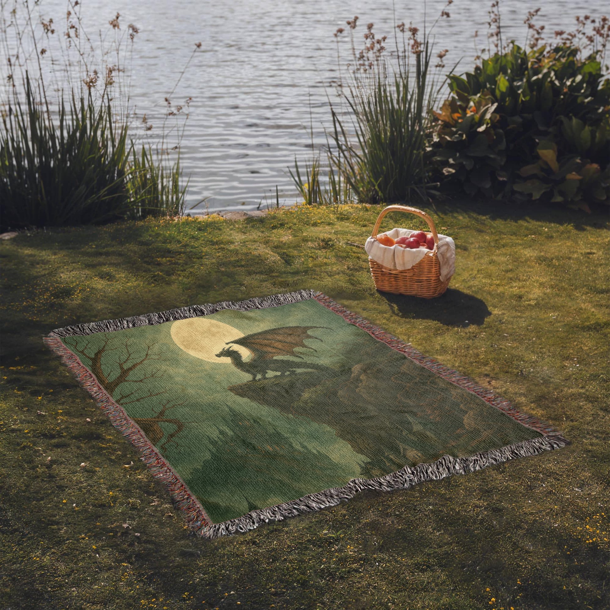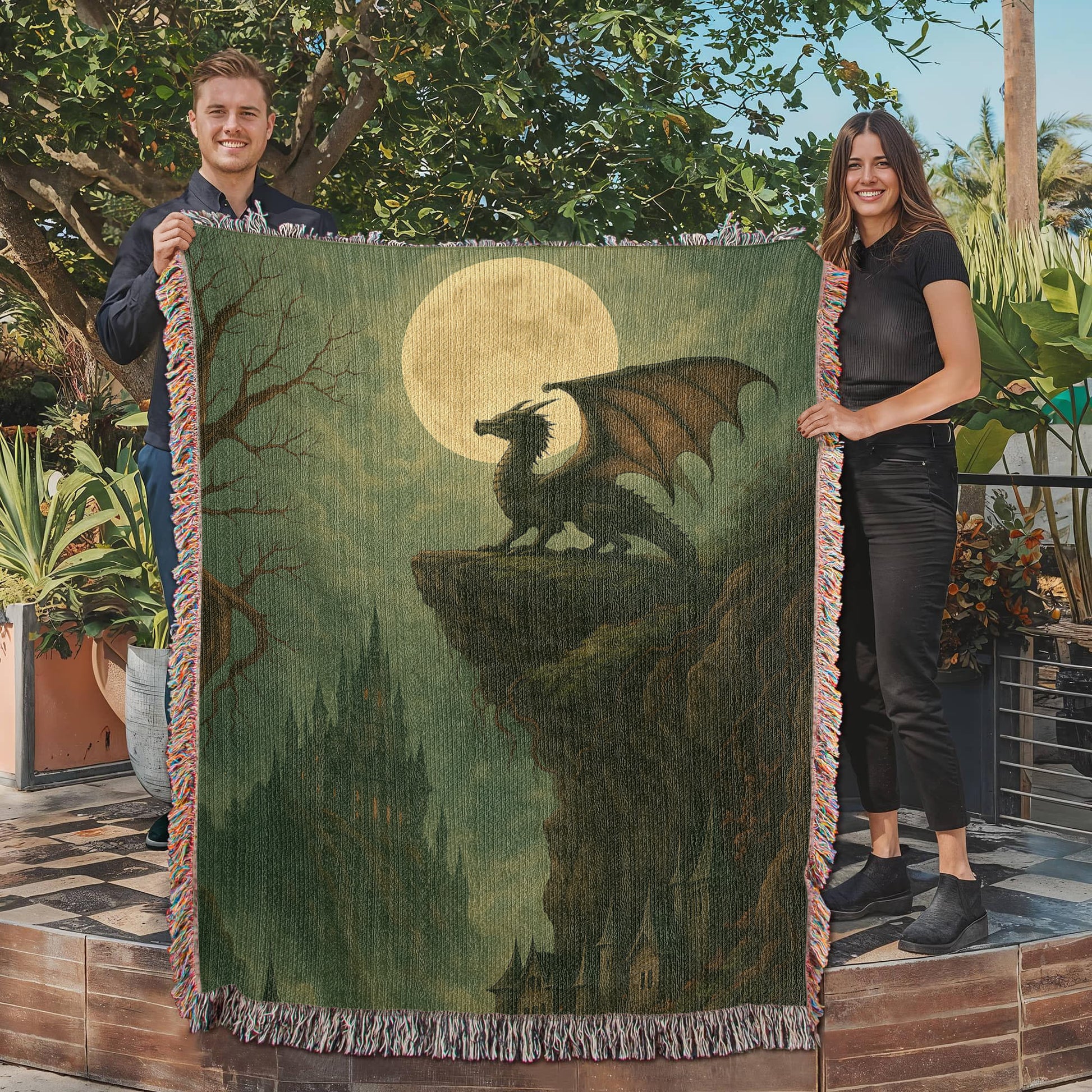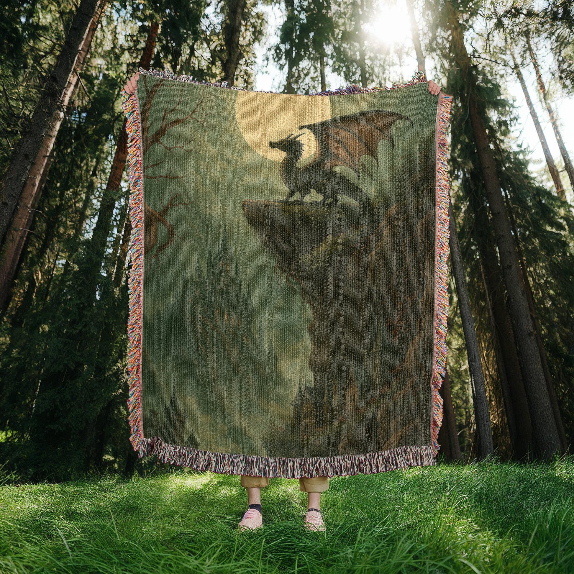 100% Cotton Woven Blanket – Majestic Dragon on Rocky Cliff under Moonlight with Castle View