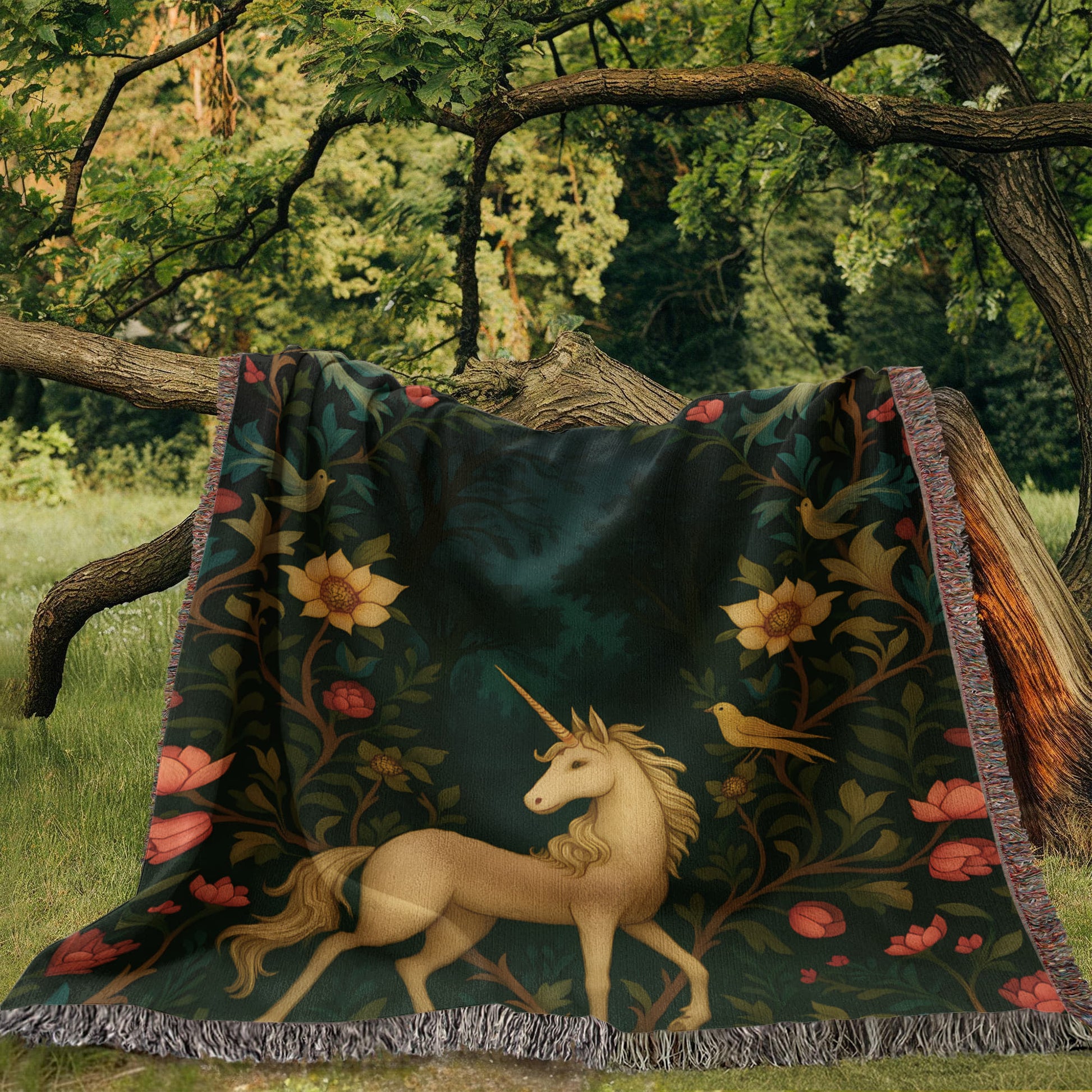 Premium Woven Cotton Throw – Enchanted Forest Unicorn Surrounded by Birds and Blossoms