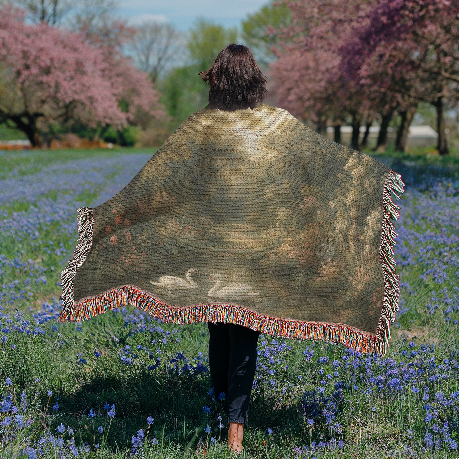 Woven Cotton Blanket – Magical Swans in Pond with Flower-Covered Shores