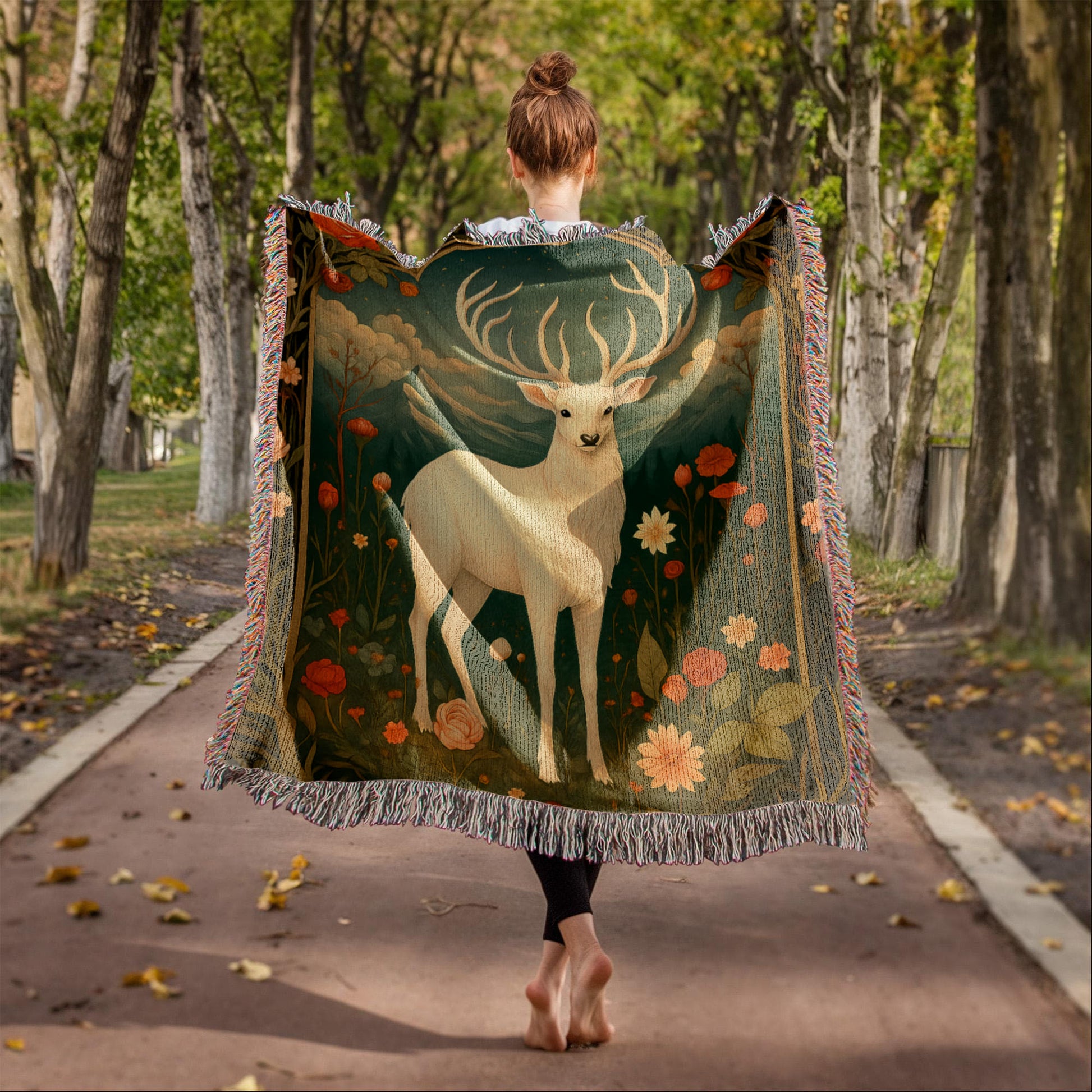100% Cotton Woven Blanket – Enchanted White Deer with Mountain Clouds and Floral Accents