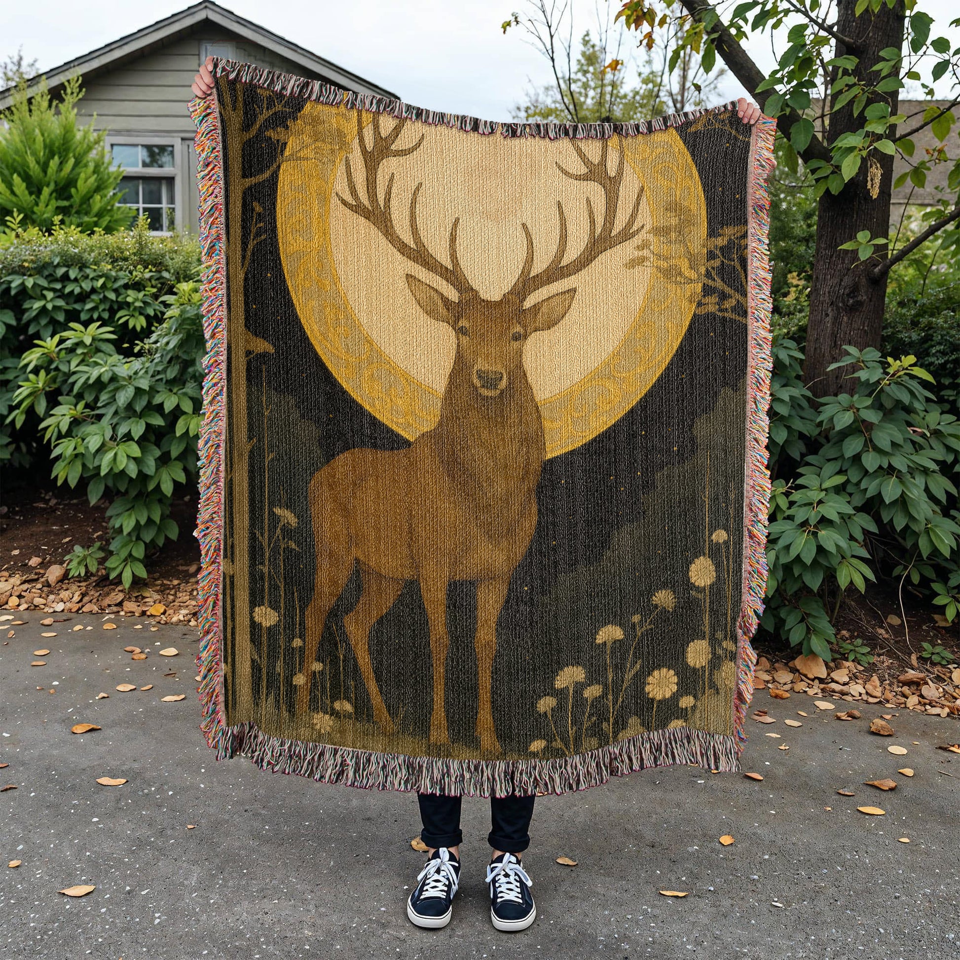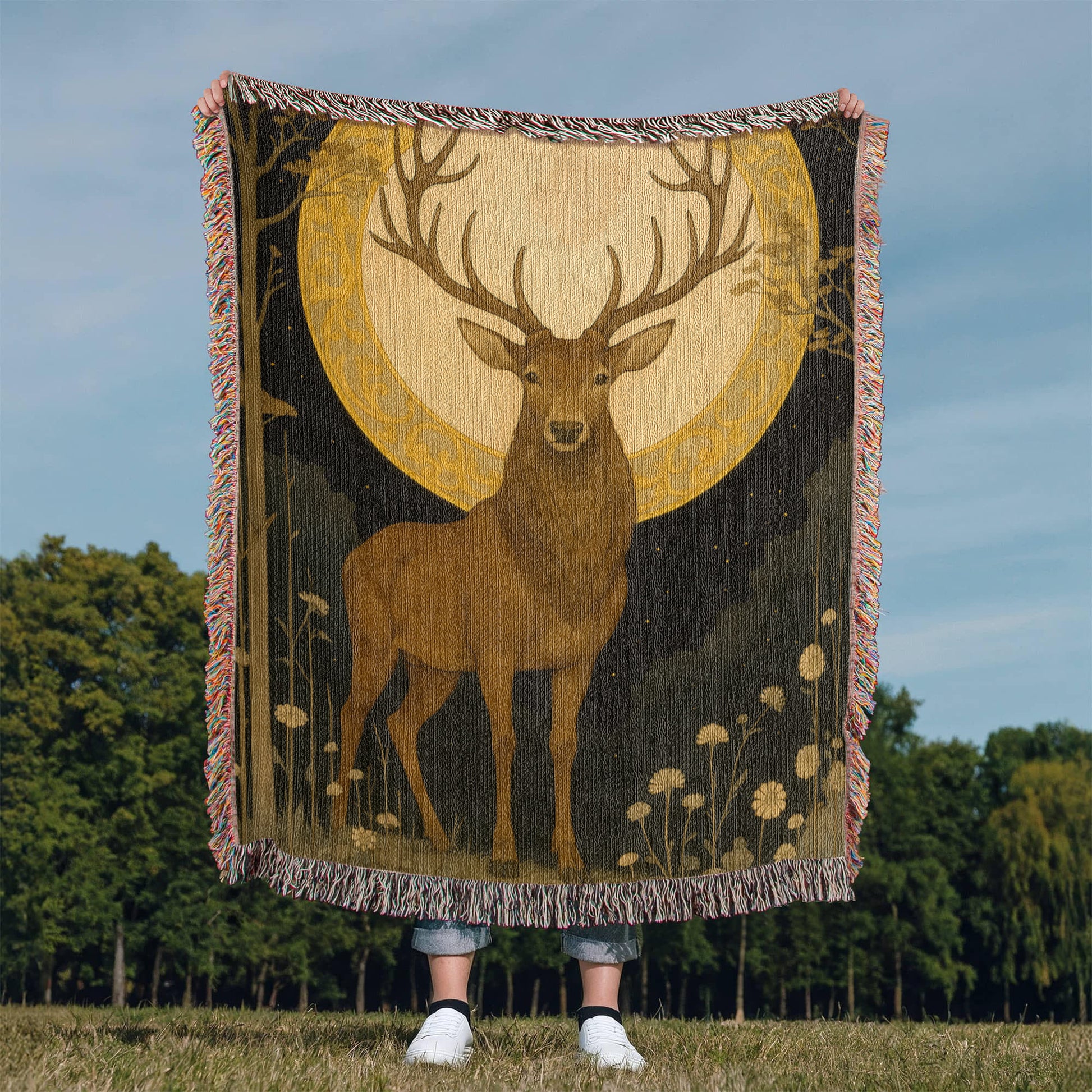 100% Cotton Woven Blanket – Majestic Deer on Night Meadow under Full Moon