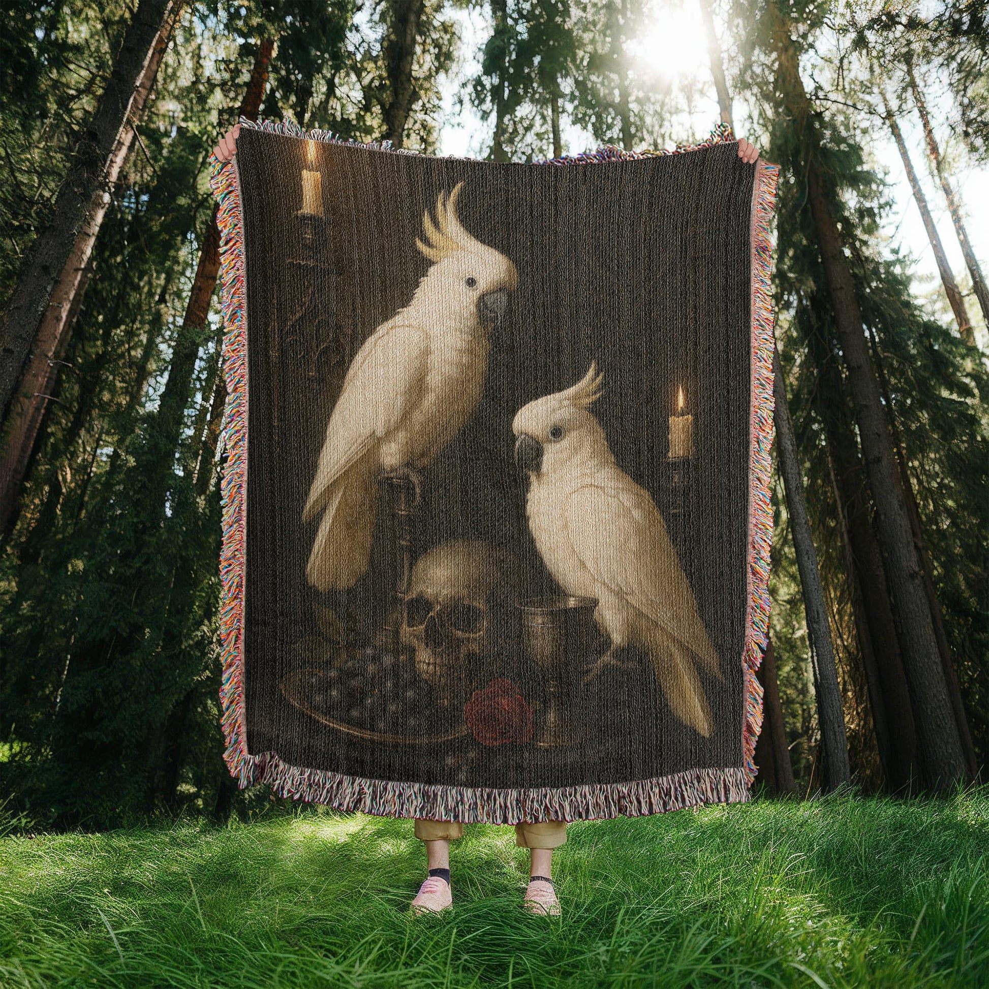 100% Cotton Woven Blanket – White Parrots on Table with Skull, Grapes, Rose and Bronze Chalice
